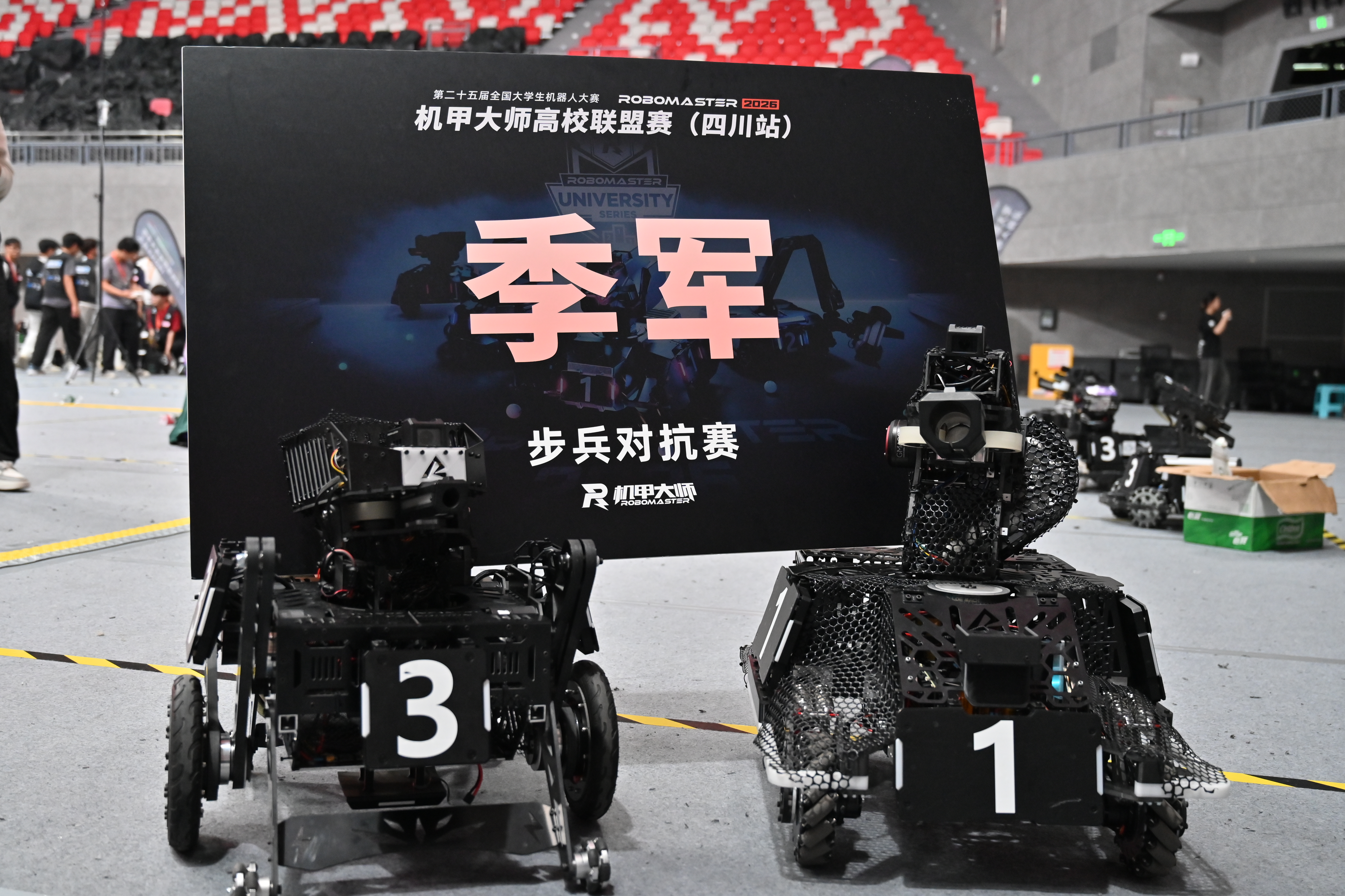 在今年的赛事现场,上演了精彩一幕。来自四川大学锦江学院的步兵机器人1V1连克强敌,斩获季军、全国一等奖;更在3V3对抗中,以两台机甲硬刚对手三台机甲,拿下全国三等奖。